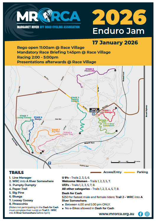 + Dash for Cash. $250 prize money for fastest male/female of all ages that is recorded between 4pm & 5pm on raceday on a mrorca chosen trail